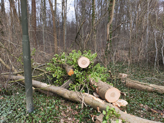 Den beigefügten Fotos ist deutlich zu entnehmen, dass gesunde Bäume gefällt worden, deren Äste eindeutig nicht über die angrenzende Straße bzw. Gehweg ragten.